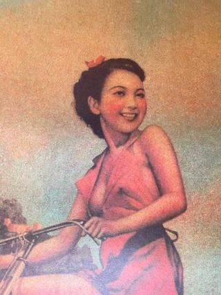 Hermosa réplica de un cartel publicitario antiguo de estilo shanghainés años 30-40. Representa a una mujer elegante en traje corto posando junto a una bicicleta, símbolo de modernidad y libertad femenina en la China de principios del siglo XX. Impreso en papel envejecido para un toque auténtico y nostálgico, perfecto para amantes del arte retro oriental. - Diseño vintage. - Colores cálidos y estilo artístico.