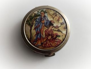 Antiguo pastillero o cajita miniatura de unos 4,5 cm. Es de metal con el interior de plástico y decorado con una bonita imagen oriental. Antiguo antigua antigüedades arcopal art nouveau brocante mueble mimbre bambú ratán cerámica decó colonial contraste hand made artesanal latón duralex lámpara espejo opalina madera colonial boho chic metalarte shabby sol murano Manises marco xix modernista porcelana industrial oro plata de ley dorado cuadro arte interiorismo silla entrada retro vintage moderno campo rural playa