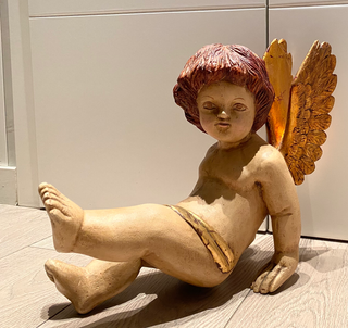 Figura decorativa de un ángel, también conocido como querubín o cupido, con un estilo de arte sacro. - Detallado diseño. - Base de apoyo incluida. + De 40cm sobre peana Precio por pieza