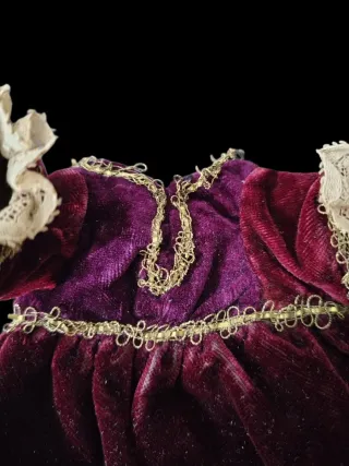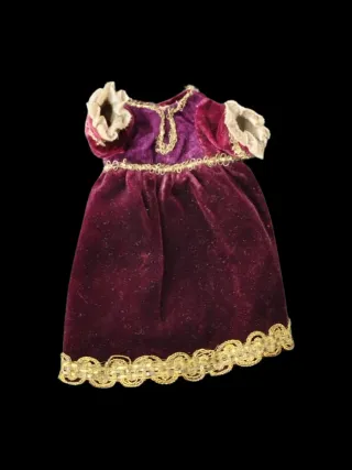 Magnífica pieza de arte sacro destinada al coleccionismo o para vestir imágenes de gran calidad. Se trata de una saya o túnica para imagen religiosa (ideal Niño Jesús o imágenes de Cap i pota), con las siguientes características: Época: Siglo XIX (posiblemente anterior). Origen: Probable trabajo monjil o conventual de gran delicadeza. Materiales: Confeccionada en terciopelo de color rojo sangre. Ribeteada con encaje metálico antiguo, de hojilla, que conserva su color original. Estado de conservación: Muy bueno para su antigüedad. Medida del largo: 15 cm Medida Manga a Manga: 11,5 cm Media de ancho del bajo: 12 cm