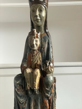 Escultura antigua de Virgen con Niño entronizada, realizada en madera tallada y policromada, siguiendo la tradición del románico catalán. Virgen coronada en posición frontal, con el Niño sentado sobre las rodillas, iconografía clásica de la Maiestas Mariae. Presenta pátina original, restos de policromía antigua y desgaste acorde a su antigüedad, lo que le aporta gran autenticidad y carácter. Pieza muy decorativa, ideal para coleccionistas, amantes del arte sacro o interiorismo rústico / histórico. Material: Madera tallada y policromada Estilo / época: Tradición románica – finales s. XIX / principios s. XX Estado: Antiguo, con des