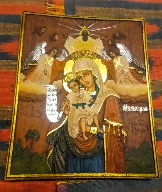 Precioso icono religioso tallado en madera, representando a Nuestra Señora de los Ángeles. Una pieza de arte sacro con detalles finos. - Talla en madera. - Representación de Nuestra Señora de los Ángeles. - Cristiano ortodoxo.
