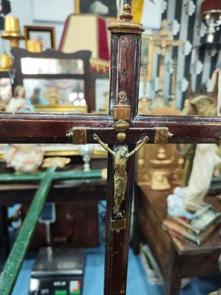 Precioso crucifijo antiguo de madera oscura con detalles en dorado. Es una pieza única con un aspecto desgastado que le da mucho encanto. MEDIDAS: 70cm alto 22cm ancho base 18cm fondo base 35cm cruz vertical 56cm cruz alto - Madera oscura con pátina. - Cristo de metal dorado. - Detalles decorativos en metal dorado. - Base de madera. Altar cáliz copón Italia Sevilla custodia Sagrario liturgico religioso arte sacro. Sevilla Córdoba jerez Andalucía talla madera Olot sacro cáliz sacerdote cura iglesia altar siglo Italia jerez Sevilla Córdoba Andalucía Francia