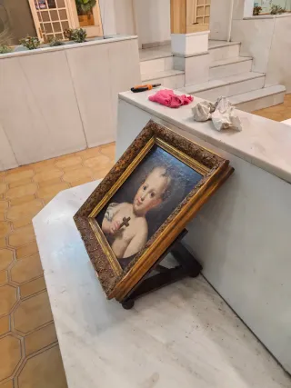 Óleo sobre tela adherida a tabla, primera mitad del siglo XVIII, escuela española. Retrato devocional de gran calidad técnica y delicadeza en carnaciones, probable obra de maestro. Iconografía del Niño Jesús con cruz, composición clásica de fondo neutro. Procedente de gran colección privada. Medidas de la tabla 52x42 cm. Incluye atril expositor y marco antiguo tallado. barroco español pintura religiosa arte sacro siglo xviii antiguo coleccionismo patrimonio historico cuadro devocional niño jesus retrato clasico escuela hispanica obra antigua original pieza unica decoracion noble interiorismo anticuario inversion cultural