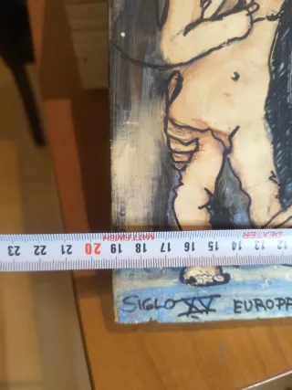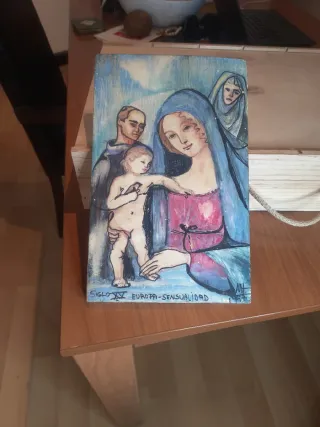 Imagen pintada en madera, firmada del año 1997 con el título Siglo 15 Europa-Sensualidad. Era parte de la colección de un familiar muy creyente. Parece que representa a una virgen con un niño, es espectacular, pero no es mi estilo y prefiero que la tenga alguien que la aprecie. La vendo por 30 euros no negociables. Saludos