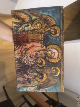 Icono religioso antiguo, probablemente de estilo ruso u ortodoxo, que representa escenas bíblicas como la Resurrección o el descenso de Cristo a los infiernos. Era parte de la colección de un familiar muy devoto, que coleccionaba este tipo de objetos. Por la inscripción posterior estuvo expuesto en un museo de arte sacro en Alemania, Reklinghausen, y está el precio en pesetas. Lo vendo por el mismo precio que costó hace 35 años, 20.000 pesetas, hoy 144 euros no negociables. Saludos
