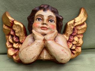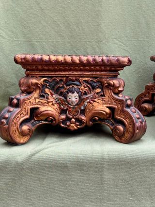 Pareja de ménsulas/peanas antiguas de estilo barroco, fabricadas en terracota con policromía a mano de autor, con detalles de querubines y acabado en pan de oro. Piezas únicas y exclusivas de arte sacro/decorativo de 20 cm, ideales para coleccionistas o decoración con carácter e historia. Debido a su peso se recomienda recogida en mano. Gracias. - Altura aproximada de 20 cm. - Diseño detallado con querubines y ornamentación. - Acabado en tonos dorados y oscuros.