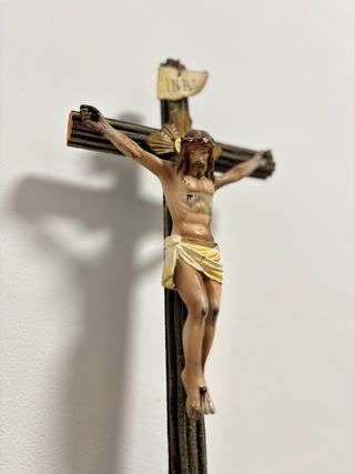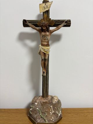 Crucifijo de la escuela de Olot, década de 1920. Figura de Cristo crucificado con cuidada anatomía y profunda expresividad, conservando la fuerza devocional propia de la imaginería catalana del primer tercio del siglo XX. - Cristo con perizoma (paño de pureza) y heridas - Cruz imitando madera natural con inscripción INRI + corona. - Base escenográfica con rocas del Gólgota y calavera simbólica de Adán. Medidas: 38 (alto) x 12 (ancho) x 9 (profundo) cm. Material: Estuco / pasta de madera policromada Uso ideal: Altar doméstico, capilla, colección de arte sacro Se recomienda pequeña restauración debido a evidentes signos de desgaste