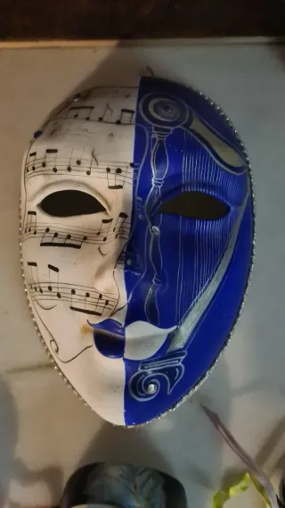 Conjunto de cuatro máscaras venecianas decorativas, perfectas para añadir un toque de arte y misterio a tu hogar. - Una máscara grande con diseño musical en blanco y azul. - Tres máscaras pequeñas con diferentes decoraciones florales y de aves. - Ideales para colgar o exhibir.