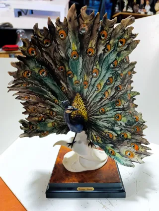 La figura es una escultura de pavo real de Giuseppe Armani para Florence Sculture d'Arte. Estas figuras suelen estar hechas de porcelana fina , son piezas de coleccionista firmadas y numeradas, como lo indica la placa en la base. Detalles de la Figura Artista: Giuseppe Armani. Marca: Florence Sculture d'Arte, Italia. Material: Principalmente porcelana Características: La figura es muy detallada, con colores vibrantes y un pavo real con su cola desplegada sobre una base de madera. Medidas aproximadas: 35.56 x 29.21 x 15.88 cm Puede contener algún fallo ver fotos se envía lo que se ve.