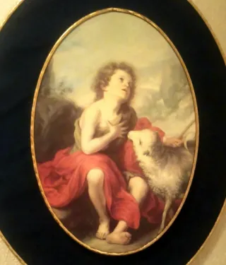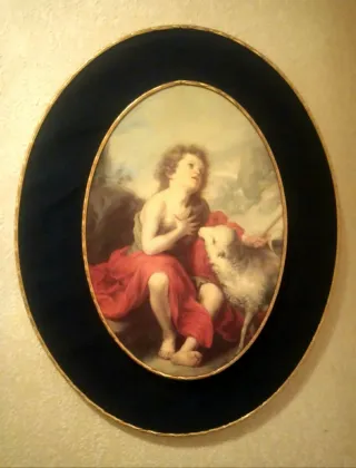 Pequeño cuadro religioso que representa a San Juan Bautista niño (San Juanito) junto al cordero (Agnus Dei), una de las imágenes más icónicas y tiernas del arte sacro, popularizada por el maestro Murillo. Lámina en un marco ovalado de terciopelo azul marino con borde dorado