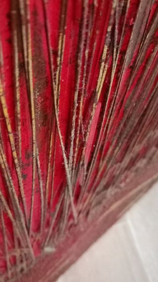 Pieza de arte decorativa pintada a mano sobre corteza de árbol. - Motivo de pájaro y flores. - Tonos vibrantes y diseño folclórico. - Marco dorado incluido.