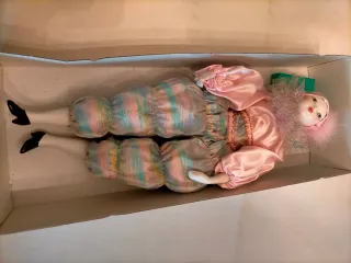 Preciosa muñeca de porcelana con un diseño de arlequín. - Vestido rosa satinado con detalles dorados. - Cuello de encaje brillante. - Gorro a juego con plumas rosas. - Rostro detallado con maquillaje. - Base de porcelana. Nunca usada, siempre en su caja, manos cara y pies de porcelana. Ropas en perfecto estado. Ideal colección. Hecha en España, original años 80. Arte deco.