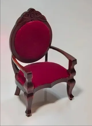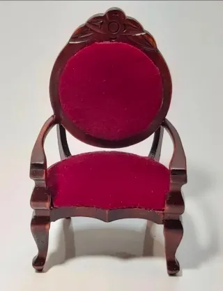 Sillón estilo Vitoriano en miniatura. S XIX Gran Bretaña, 1837-1901 Sillón en madera imitando a la caoba, con tapizado aterciopelado en color burdeos. Está compuesto por dos soportes posteriores acabados en sable que se prolongan en suave curva para sostener un respaldo oval de marco grueso, rematado en el copete por una talla de elementos vegetales. Dos brazos ligeramente arqueados se apoyan en sendas ménsulas que descansan en el faldón. Del mismo salen las patas delanteras, de forma cabriolada. El asiento tiene perfil de escudo. Medidas aproximadas: 5.5x4x9cm. Más sillas en miniatura en mi perfil.