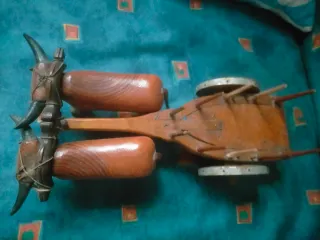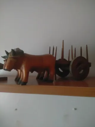 Conjunto decorativo de bueyes y carro de madera. Mando una foto de su pata q esta - Figuras de bueyes talladas en madera. - Carro de madera con detalles. - Ideal para coleccionistas o decoración.