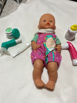 Muñeca Nenuco con varios accesorios para jugar. - Muñeca Nenuco. - Biberón. - Tarrito con crema. - Termómetro. - Estetoscopio. - Pañuelo.