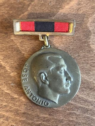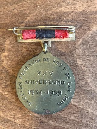 Medalla conmemorativa con la efigie de José Antonio y su nombre grabado. Medalla conmemorativa 25⁰ aniversario 1934-1959 "Sección Femenina de FET y de las JONS". En buen estado. - Cinta tricolor (rojo, negro, rojo) con pasador. - Diseño circular en metal.