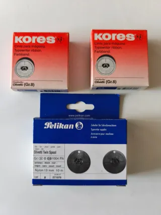 Lote de cintas de tinta para máquinas de escribir Olivetti. Sin abrir. Embalaje original. Años 80. - Cinta Kores para Olivetti (Gr.8). - Cinta dactylo Gr.8 (Algodón/Cotton/Baumwolle) 13mm x 8m. - Pelikan Olivetti Twin Spool, Nylon 13 mm 10 m, color negro/black/noir.