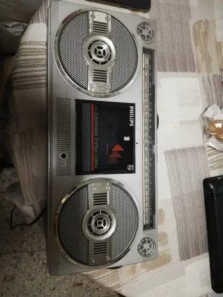Boombox Philips con radio y reproductor de cassette. Un clásico para disfrutar de tu música. - Diseño retro plateado. - Altavoces integrados. - Sintonizador de radio. - Compartimento para cassette.