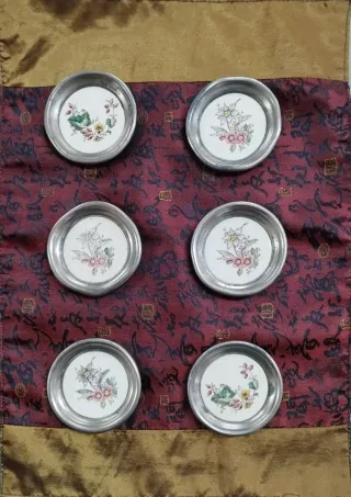 Conjunto de seis posavasos de porcelana con delicados diseños florales. - Material: Porcelana y metal. - Diseño: Motivos florales variados. - Probablemente de Max Dannhorn - Diámetro exterior 7cm e interior 5 cm