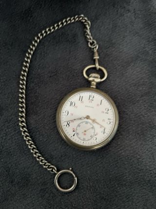 Reloj de bolsillo Zenith suizo original, vintage. Esfera blanca con números árabes y escala 24 h en rojo. Pequeño segundero a las 6. Incluye cadena. Movimiento mecánico original limpio y en buen estado (ver foto). El reloj funciona correctamente. Desgaste normal por la edad. Ideal para coleccionistas. Escucho ofertas razonables.