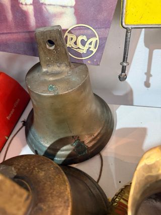 Campana antigua con soporte decorativo de forja. - Soporte de hierro forjado con detalles ornamentales. - Campana de metal con acabado oscuro.