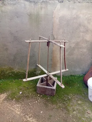 Se vende antiguo aparato de hilar lana, una pieza de madera con un diseño rústico. - Estructura de madera. - Base de caja de madera. - Eje central metálico.