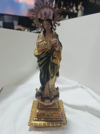 Figura religiosa de la Inmaculada Concepción. 29 cm sin corona y potencia Es macisa con manos de plomo. Probablemente de Olot - Base dorada con detalles. - Aureola en metal de estrellas. Corona en metal - Vestimenta detallada.