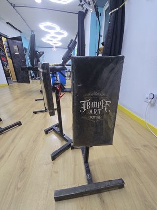 Reposabrazos profesional para tatuajes, con un diseño artesanal. Ambos por 100 , uno por 70 , hechos por soldador enfemoniado - Estructura metálica negra. - Acolchado negro con logo 'Temple Art Tattoo'. - Altura ajustable.