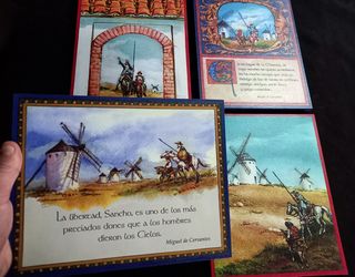 Colección de cuatro cuadritos de madera formato 20x25 cm con diferentes motivos inspirados en la obra El Quijote de Miguel de Cervantes como el texto inicial de la novela o la famosa escena de los molinos. Se pueden colgar con una pequeña hembrilla (va incluida). Imágenes selladas y fusionadas sobre la madera. Se hacen envíos. Entrega en mano en Ávila capital. También disponibles otros modelos en cerámica. Más artículos para regalo o decoración en mi perfil.