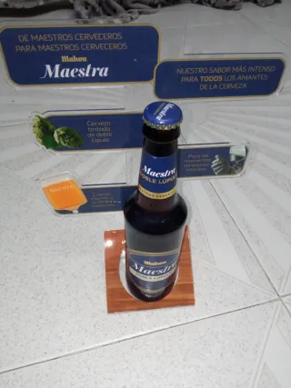 Expositor de la cerveza Mahou Maestra Doble Lúpulo. - Diseño con el logo de Mahou. - Incluye texto promocional sobre la cerveza.