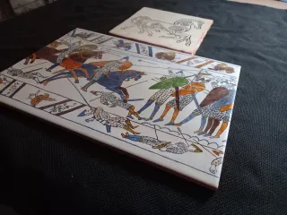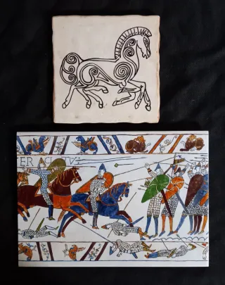 Conjunto de dos azulejos decorativos con motivos históricos. - Azulejo con diseño de caballo celta. - Azulejo con escena de batalla estilo tapiz medieval. Imagen indeleble, disponen de colgador. Se hacen envíos.