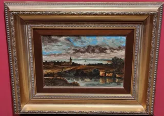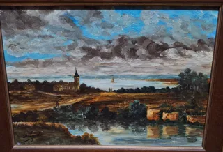 Paisaje al oleo clásico con mucha profundidad.Se trata de un lago en primer plano,rodeado de bosques,un personaje pot un camino que va a una pequeña aldea con torre.Dos personajes mirando un mar de nubes y al fondo se ven unas montañas,cielo en tonos ocres.Se puede enviar o entrega en mano.
