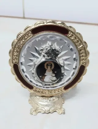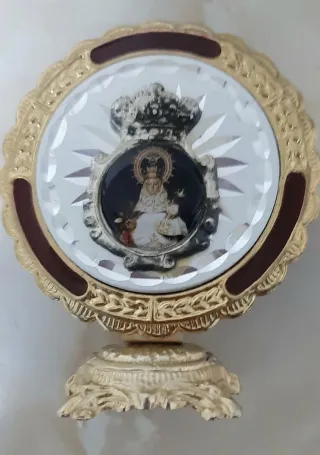Precioso relicario de la Virgen del Rocío. Diseño circular con marco y base dorada con ornamentacion. Para coleccionismo o personas devotas