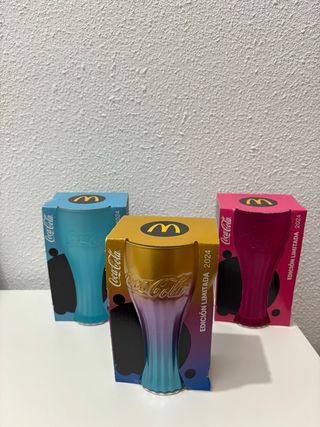 Vendo vasos oficiales de la última promoción de Coca-Cola y McDonald's 2024. Están totalmente nuevos, nunca se han usado y conservan su caja de cartón original en perfecto estado. PRECIOS INDIVIDUALES: Vaso Dorado (Especial): 8,00 € (Es el más difícil de conseguir de la colección). Vaso Azul Turquesa: 5,00 €. Vaso Rosa/Fucsia: 5,00 €. 🔥 OFERTA LOTE (Los 3 vasos): 15,00 €