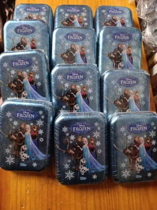 Lote de 12 cajas metálicas de la película Frozen. Cada caja contiene 24 cromos. - Diseño inspirado en la película. - Ideal para coleccionistas. - Cada caja incluye 24 cartas.