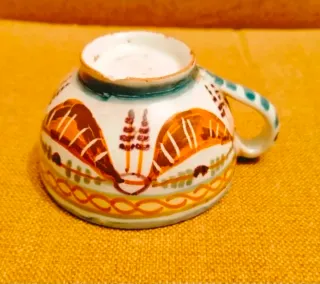 Taza de cerámica antigua con un diseño decorativo. - Motivos geométricos y florales. - Colores vivos y detalles pintados a mano. - Asa lateral.