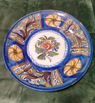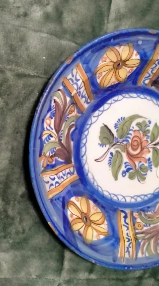 Precioso plato antiguo de cerámica con un diseño floral pintado a mano. Se encuentra en buen estado. - Decoración con flores y motivos geométricos. - Colores vibrantes: azul, amarillo, naranja y marrón. - Borde decorado con un patrón ondulado.