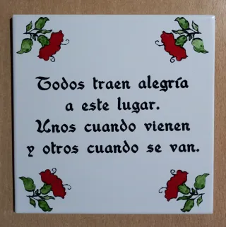 Azulejo decorativo tamaño 20x25 cm con una frase inspiradora: Todos traen alegría a este lugar. Unos cuando vienen y otros cuando se van. - Decorado con motivos florales en las esquinas pintado a mano. Disponen de colgador. Se hacen envíos.