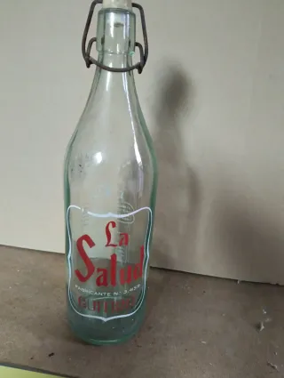 Botella de vidrio antigua con cierre de alambre y tapón de corcho. - Etiqueta La Salud con detalles en rojo y blanco. - Inscripción FABRICANTE N. 3.459 GUIMARAES.