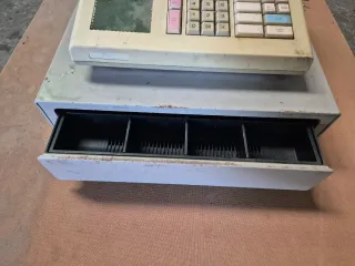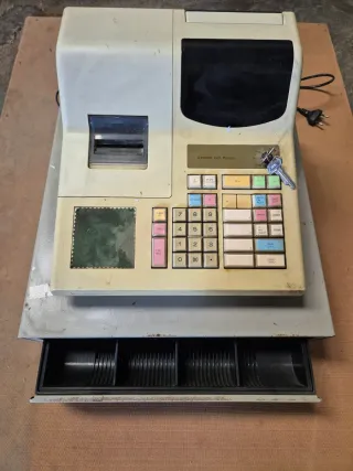 Caja registradora electrónica Sharp. Incluye un cajón con compartimentos para billetes y monedas. Cuenta con un teclado numérico y varias teclas de función para registrar transacciones. Utiliza un rollo de papel para imprimir recibos y un interruptor de modo con llave para diferentes funciones. Es un dispositivo diseñado para calcular y registrar ventas en negocios minoristas.