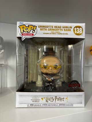 Figura Funko Pop Deluxe del Gringotts Head Goblin con el banco Gringotts, número 138. - Personaje: Gringotts Head Goblin. - Serie: Harry Potter. - Edición: Deluxe, Special Edition. - Incluye el banco Gringotts. - Entrega con peana independiente para el funko