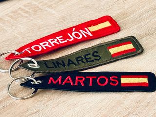 Llaveros personalizados con bordado de alta calidad. Bordado en ambas caras con mismo texto. - Diseño con nombre y bandera de España. - Material textil resistente. - Ideal para llaves o equipaje o lo que desees. Primera imagen: llaveros reales. Ultima imagen: medidas exactas Pregunta sin compromiso, o dime lo que desearías escribir o bordar, y el numero de unidades. Por lote con mismo texto se puede mirar precio, de unidad a unidad por texto, imposible negociar precio. Se hacen envíos, pero en mano se puede entregar en Torrejon de Ardoz, Coslada y Guadalajara. Militar bordados parches airsoft españa coleccion