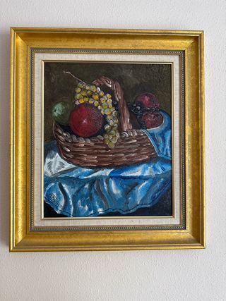 Cuadro de naturaleza muerta pintado al óleo sobre lienzo enmarcado. Representa una cesta de frutas. 55x62 - Cesta de mimbre con uvas, manzanas y otras frutas. - Fondo oscuro y tela azul. - Firmado A.Peña y fechado en 1995.