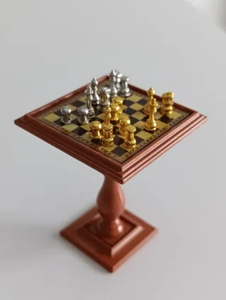 Ajedrez en miniatura para casa de muñecas a escala 1:12. Medidas en las últimas fotos. - Piezas de ajedrez doradas y plateadas. - Tablero con diseño clásico. - Mesa de soporte de color marrón.