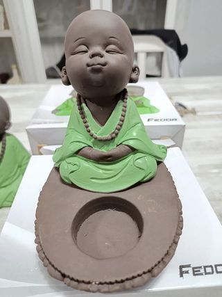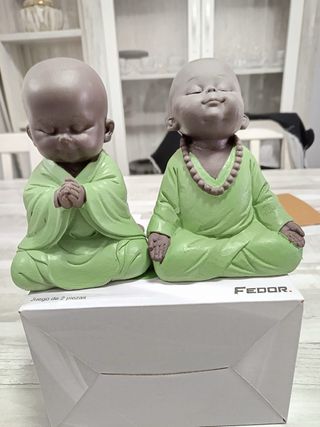 Set de tres figuras decorativas de budas en pose de meditación. Perfectas para crear un ambiente de paz y serenidad. - Figuras de budas. - Color verde. - Incluye 3 piezas.