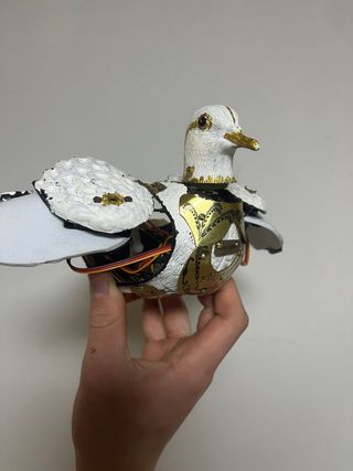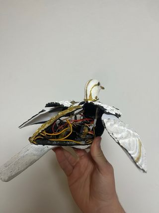 Paloma animatrónica decorativa con detalles dorados. - Diseño blanco y dorado. - Aspecto de armadura. - Alas blancas.