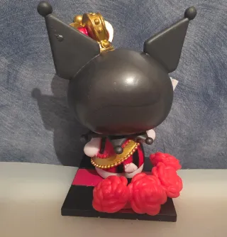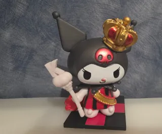 Figura coleccionable de Kuromi con temática de reina de póker. - Diseño detallado de Kuromi vestida de reina. - Incluye corona dorada y cetro. - Base con diseño de tablero de ajedrez.