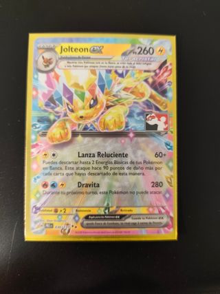 Carta Pokémon de Jolteon EX con arte Teracristal. - Ataque Lanza Reluciente con daño base de 60+. - Ataque Dravita con 280 de daño. - Habilidad Regla para los Pokémon EX. - Debilidad x2. - Coste de retirada: 4.