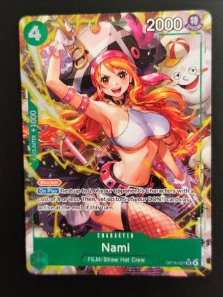 Carta de Nami del juego de cartas coleccionables One Piece, edición especial con arte alternativo. - Número de carta: OP14-031 - Tipo: Personaje - Afiliación: FILM/Straw Hat Crew - Habilidad: Blocker - Coste: 4 - Poder: 2000 - Contador: +1000 - Ilustrador: Hashimoto. Q Envío rápido y protegido